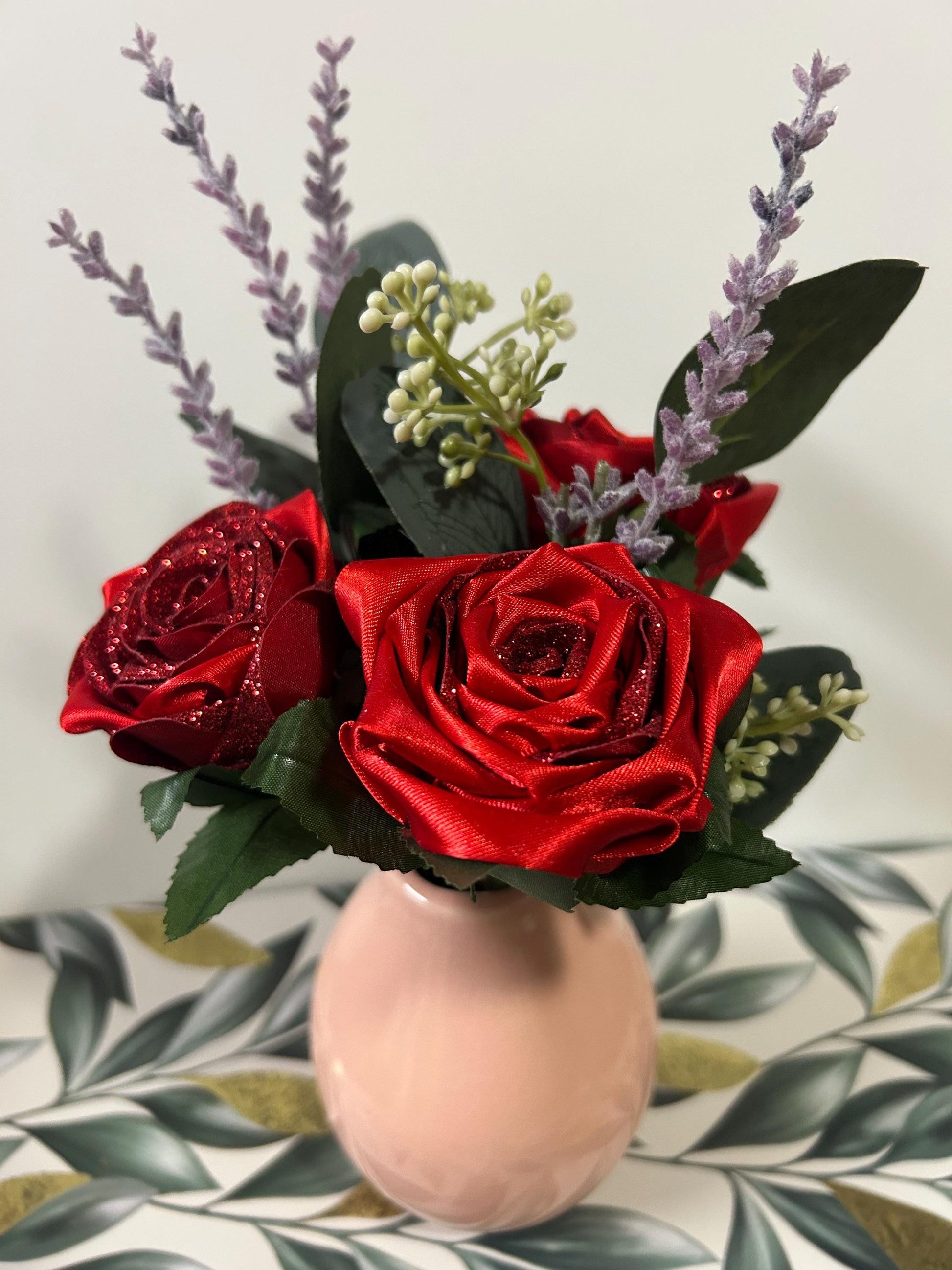 Red Glitter Ribbon Rose Bouquet: Handmade Keepsake in Blush Vase